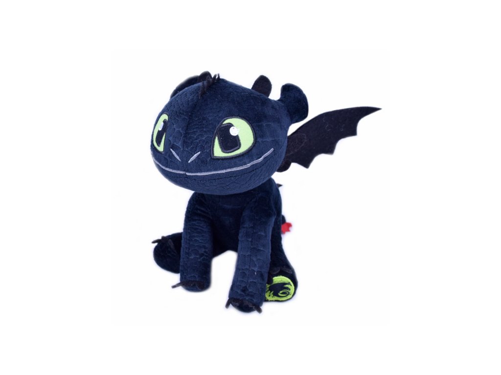 Velká plyšová postavička dráčka Bezzubky z oblíbeného filmu Jak vycvičit draka. Tento černý dráček s velkýma zelenýma očima a typickými křídly je vyroben z hebkého materiálu a působí naprosto roztomile. Díky velikosti 80 cm se stane skvělým společníkem na mazlení i výraznou dekorací do dětského pokoje.